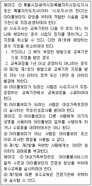 시ㆍ도지사는 아이돌보미 양성을 위한 교육기관을 지정ㆍ운영하고 보수교육을 실시하여야 한다.