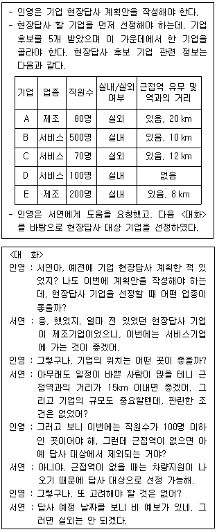 다음 글과 <대화>를 근거로 판단할 때, 인영이가 현장답사 대상으로 선정한 기업은?