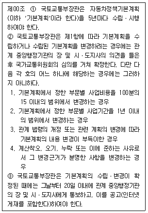 관계 법령의 개정에 따라 기본계획의 내용 변경이 부득이한 경우, 국토교통부장관은 기본계획을 변경하려면 관계 중앙행정기관의 장 및 시ㆍ도지사의 의견을 들어야 한다.