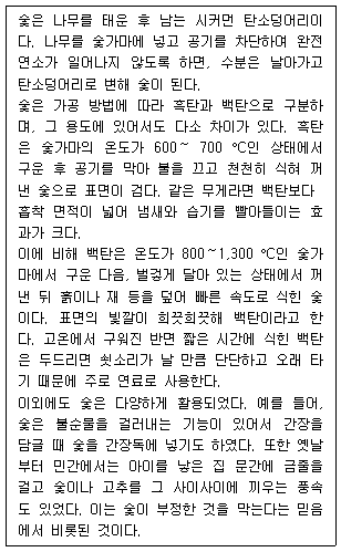 나무가 숯가마에서 완전연소가 되면 숯으로 변한다.
