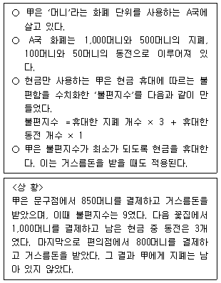 다음 글과 <상황>을 근거로 판단할 때, 甲이 문구점에 들어갈 때 휴대하였던 동전의 개수는?