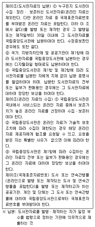 국립중앙도서관은 국내에서 서비스되는 온라인 자료 중 국제표준 자료번호를 부여받지 않은 자료에 대해서는 수집ㆍ보존의무가 없다.