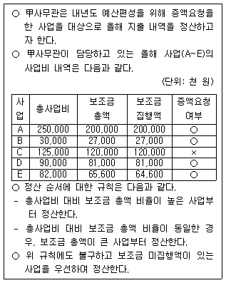 다음 글을 근거로 판단할 때, 甲사무관이 세 번째로 정산할 사업은?