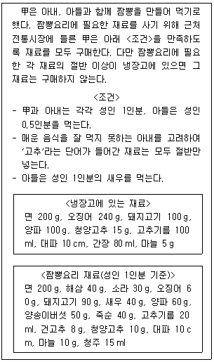 다음 글을 근거로 판단할 때, 甲이 구매해야 할 재료와 그 양으로 옳은 것은?