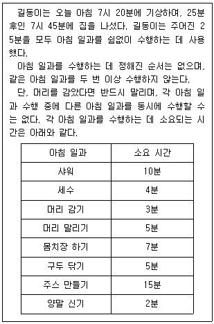 다음 글을 근거로 판단할 때, 길동이가 오늘 아침에 수행한 아침 일과에 포함될 수 없는 것은?