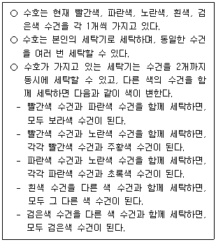 다음 글을 근거로 판단할 때, 수호가 세탁을 통해 가질 수 있는 수건의 색조합으로 옳지 않은 것은?
