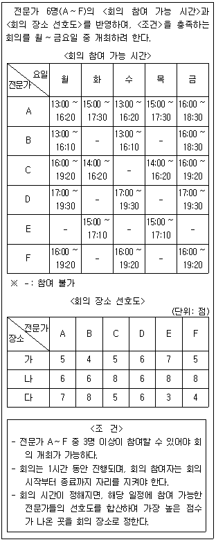 C, D를 포함하여 4명 이상이 참여해야 할 경우 금요일 17시에 회의를 개최할 수 있다.