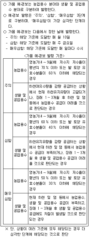 영농기에 밭 토양 유효수분율이 70%일 경우 농업용수 가뭄 예ㆍ경보를 그 달 10일에 발령한다.