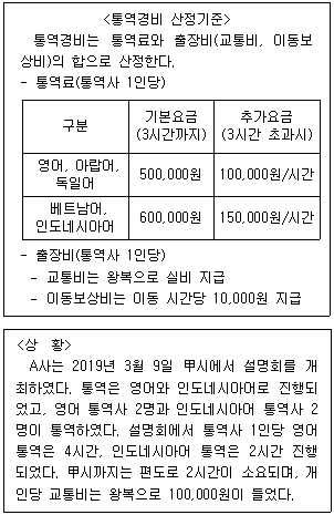 다음 <통역경비 산정기준>과 <상황>을 근거로 판단할 때, A사가 甲시에서 개최한 설명회에 쓴 총 통역경비는?