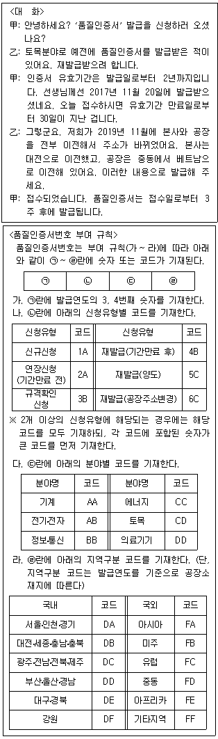 다음 <대화>와 <품질인증서번호 부여 규칙>을 근거로 판단할 때, 乙이 발급받은 품질인증서번호는?
