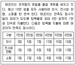 다음 글을 근거로 판단할 때, 태은이의 만족도 점수의 합은?