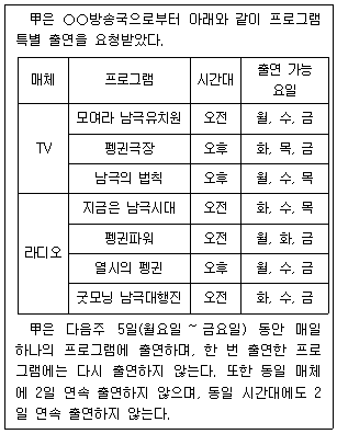 다음 글을 근거로 판단할 때, 甲이 출연할 요일과 프로그램을 옳게 짝지은 것은?(순서대로 요일, 프로그램)