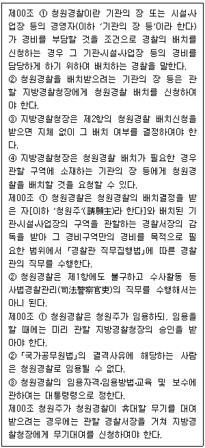 청원경찰은 배치된 사업장의 경비를 목적으로 필요한 범위에서 수사활동 등 사법경찰관리의 직무를 수행할 수 있다.