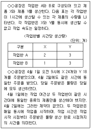 다음 글을 근거로 판단할 때, ○○공장에서 4월 1일과 4월 2일에 작업한 최소 시간의 합은?