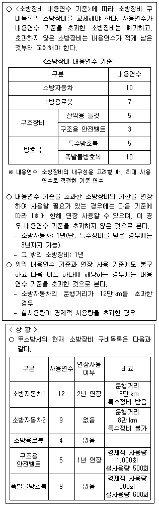다음 글과 <상황>을 근거로 판단할 때, 甲소방서에서 폐기대상을 제외하고 가장 먼저 교체대상이 될 장비는?