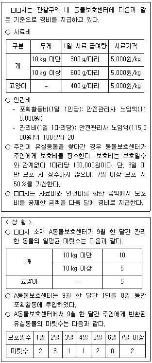 다음 글과 <상황>을 근거로 판단할 때, □□시가 A동물보호센터에 10월 지급할 경비의 총액은?