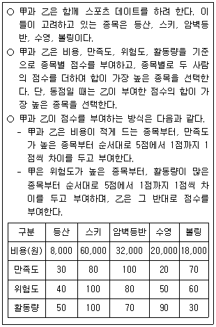 다음 글을 근거로 판단할 때, 甲과 乙이 선택할 스포츠 종목은?