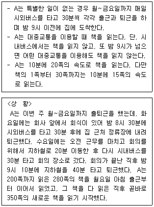 다음 글과 <상황>을 근거로 판단할 때, A가 새로 읽기 시작한 350쪽의 책을 다 읽은 때는?