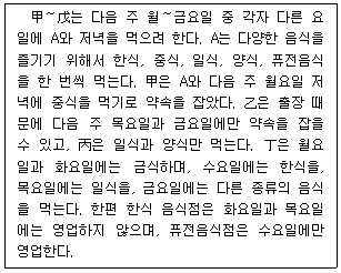 다음 글을 근거로 판단할 때, 다음 주에 戊가 A와 함께 먹을 음식의 종류는?