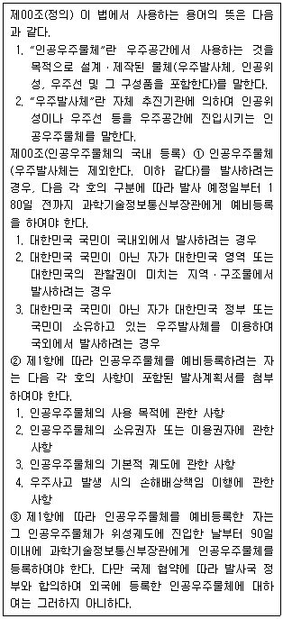 대한민국 국민이 우주발사체를 발사하려는 경우, 과학기술정보통신부장관에게 그 발사체를 예비등록하여야 한다.