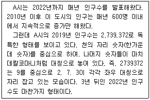 다음 글을 근거로 판단할 때, 2022년 A시 인구수의 천의 자리 숫자는?