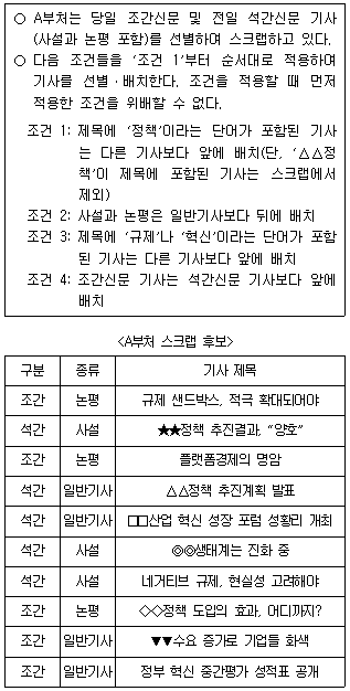 다음 글과 <A부처 스크랩 후보>를 근거로 판단할 때, 스크랩의 앞에서부터 5번째에 배치되는 기사 제목은?