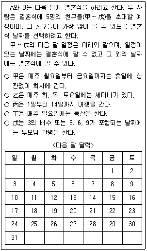 다음 글을 근거로 판단할 때, A와 B가 선택하지 않을 결혼식 날짜는?