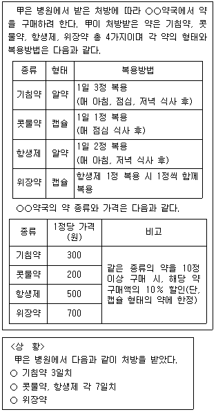 다음 글과 <상황>을 근거로 판단할 때, 甲이 ○○약국에 지불해야 할 약값의 총액은?