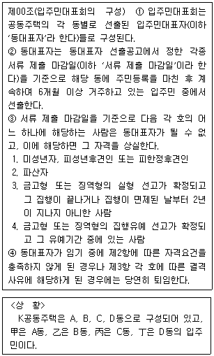 K공동주택의 입주민대표회는 A, B, C, D동의 동별 구분 없이 선출된 입주민대표자들로 구성된다.