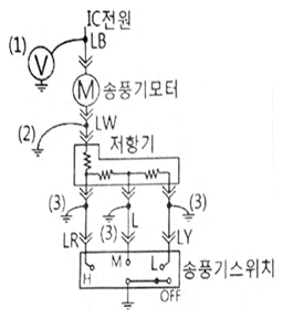멀티미터의 전압계를 이용하여 그림과 같이 송풍기 회로의 이상 유무를 점검하는 방법으로 틀린 것은?