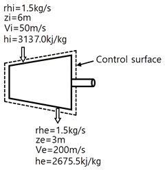 증기터빈에서 질량유량이 1.5㎏/s이고, 열손실률이 8.5㎾이다. 터빈으로 출입하는 수증기에 대한 값은 아래 그림과 같다면 터빈의 출력은 약 몇 ㎾인가?