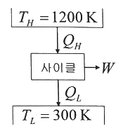 그림과 같은 열기관 사이클이 있을 때 실제 가능한 공급열량(QH)과 일량(W)은 얼마인가? (단, QL은 방열열량이다.)