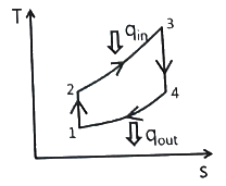 어떤 기체 동력장치가 이상적인 브레이턴 사이클로 다음과 같이 작동할 때 이 사이클의 열효율은 약 몇 % 인가? (단, 온도(T)-엔트로피(s) 선도에서 T1 = 30℃, T2 = 200℃, T3 = 1060℃, T4 = 160℃ 이다.)