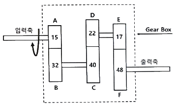 그림과 같은 Gear Box에서 입력축 회전속도 1400rpm, 토크 75kgf·m 일 때 입력마력과 출력축의 회전속도는? (단, 그림의 숫자는 기어의 잇수이다.)