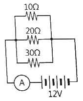 그림과 같이 10Ω, 20Ω, 30Ω의 저항이 병렬로 연결되어 전류계와 함께 배터리에 연결되어 있을 때 전류계에 흐르는 전류(A)는?