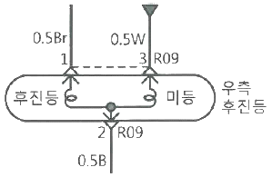 다음 그림과 같이 우측 후진등을 점검할 때, R09 커넥터 3번 단자에 연결된 배선 색상은?