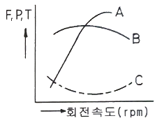 자동차 엔진의 성능곡선에서 A, B, C가 의미하는 것은? (단, F는 연료소비율, P는 축출력, T는 축토크이다.)