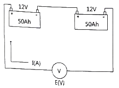 그림과 같이 12V 배터리 2개를 직렬로 연결하여 정전류(표준) 충전을 할 때 적합한 전압과 전류는?