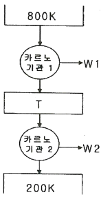 그림과 같이 카르노 사이클로 운전하는 기관 2개가 직렬로 연결되어 있는 시스템에서 두 열기관의 효율이 똑같다고 하면 중간 온도 T는 약 몇 K 인가?
