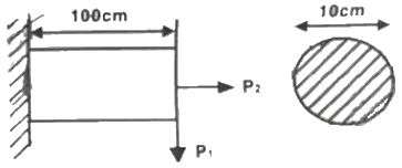 그림과 같이 직격 10cm의 원형 단면을 갖는 외팔보에서 굽힘하중 P1만 작용할 때의 굽힘응력은 인장하중 P2만 작용할 때의 응력의 약 몇 배가 되는가? (단, P1=P2=10kN이다.)