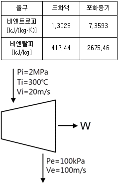 압력 2MPa, 온도 300℃의 수증기가 20m/s 속도로 증기터빈으로 들어간다. 터빈 출력에서 수증기 압력이 100kPa, 속도는 100m/s이다. 가역 단열과정으로 가정 시, 터빈을 통과하는 수증기 1kg당 출력일은 약 몇 kJ/kg인가? (단, 수증기표로부터 2MPa, 300℃에서 비엔탈피는 3023.5kJ/kg, 비엔트로피는 6.7663kJ/(kgㆍK)이고, 출구에서의 비엔탈피 및 비엔트로피는 아래 표와 같다.)
