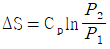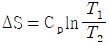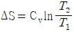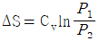 단위질량의 이상기체가 정적과정 하에서 온도가 T1에서 T2로 변하였고, 압력도 P1에서 P2로 변하였다면, 엔트로피 변화량 ΔS는? (단, Cv와 Cp는 각각 정적비열과 정압비열이다.)