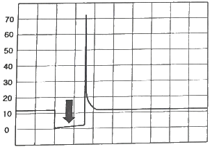 다음 접지(-) 제어형 가솔린 인젝터 파형에서 아래쪽 화살표가 가리키는 곳의 설명으로 옳은 것은?