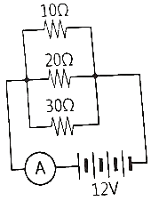 그림과 같이 10Ω, 20Ω, 30Ω의 저항이 병렬로 연결되어 전류계와 함께 배터리에 연결되어 있을 때 전류계에 흐르는 전류는 몇 A인가?