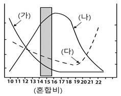 가솔린 엔진의 혼합비와 배기가스 배출 특성의 관계 그래프에서 (가), (나), (다)에 알맞은 유해가스를 순서대로 나타낸 것은?