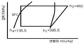 아래 선도와 같은 암모니아 냉동기의 이론 성적계수(ⓐ)와 성적계수(ⓑ)는 얼마인가? (단, 팽창밸브 직전의 액온도는 32℃이고, 흡입가스는 건포화증기이며, 압축효율은 0.85, 기계효율은 0.91로 한다)