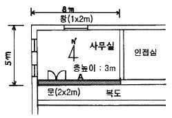 인접실, 복도, 상층, 하층이 공조되지 않는 일반 사무실의 남측 내벽(A)의 손실 열량(kcal/h)은? (단, 설계조건은 실내온도 20℃, 실외온도 0℃, 내벽 열통과율(k)은 1.6kcal/m2ㆍhㆍ℃로 한다.)