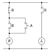 그림과 같은 시퀀스제어회로가 나타내는 것은? (단, A와 B는 푸시버튼스위치, R은 전자접촉기, L은 램프이다.)