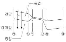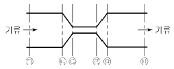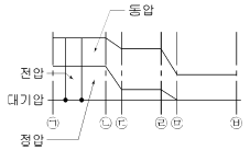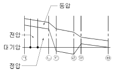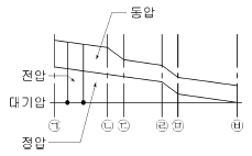 그림과 같은 단면을 가진 덕트에서 정압, 동압, 전압의 변화를 나타낸 것으로 옳은 것은? (단, 덕트의 길이는 일정한 것으로 한다.)