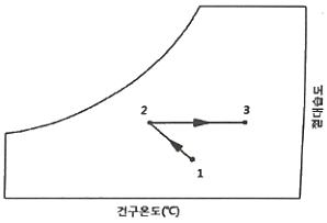 아래 습공기선도에서 습공기의 상태가 1지점에서 2지점을 거쳐 3지점으로 이동하였다. 이 습공기가 거친 과정은? (단, 1, 2회 엔탈피는 같다.)